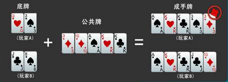上图中,玩家A的成手牌有两对,玩家B有一对,根据比牌规则,两对大于一对,所以玩家A胜出
